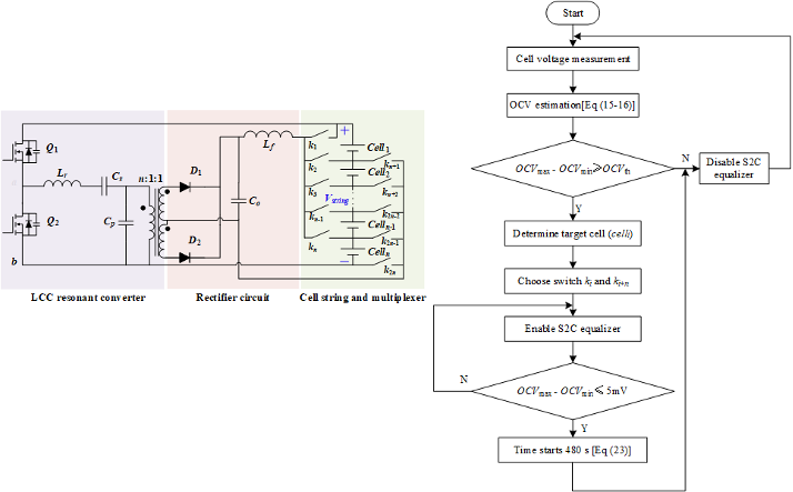 Compared with passive equalizations, active equalizations usually require complex control circuits, and the attenuation of current in the equalization process will affect the equalization speed. To reduce the control complexity of the circuit and improve the battery equalization speed, the researchers systematically studied the output characteristics of LCC resonant converters and compensated for the non-ideal characteristics of lithium batteries in the process of charging and discharging. This work adopts the equalization architecture from string to cell, using the good constant current output characteristics of LCC resonant topology at the resonant frequency point, and the efficient equalization of open-loop constant current control is realized. It can be seen that the proposed equalization technology can effectively ensure the consistency of battery pack operation. Meanwhile, the soft switching technology used in this work can allow the equalizer to achieve 88.1% energy conversion efficiency.