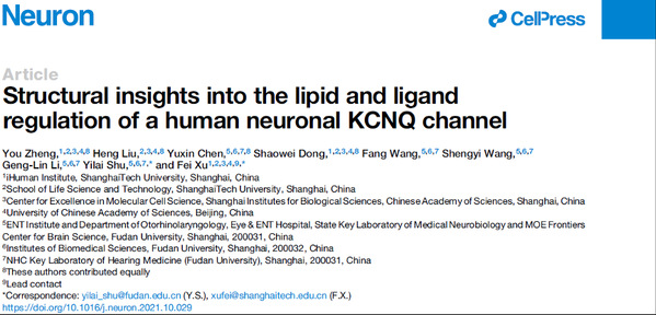 Recently, Associate Professor Xu Fei from the iHuman Institute together with her collaborator, Professor Shu Yilai from Eye & ENT Hospital of Fudan University, published their research results in a paper entitled “Structural insights into the lipid and ligand regulation of a human neuronal KCNQ channel” in Neuron. This work reported cryo-EM structures of human KCNQ4 channels in the absence and presence of the signaling lipid PIP2 and revealed the mechanism of PIP2 molecules in channel opening. This structural finding provides an accurate template for future targeted drug design and optimization.