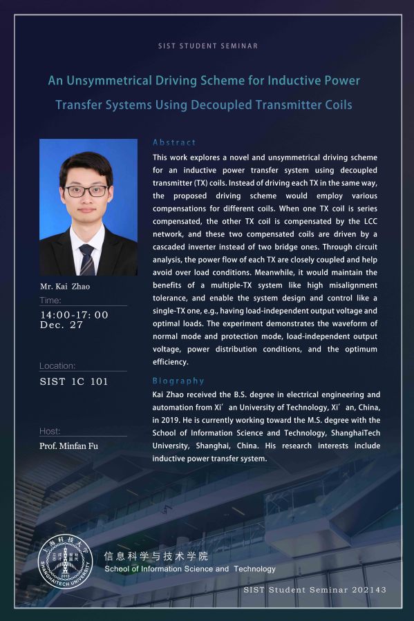 Kai Zhao received the B.S. degree in electrical engineering and automation from Xi’an University of Technology, Xi’an, China, in 2019. He is currently working toward the M.S. degree with the School of Information Science and Technology, ShanghaiTech University, Shanghai, China. His research interests include inductive power transfer system.