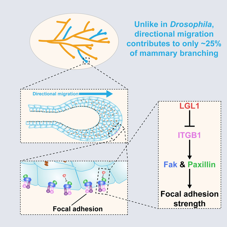 The findings were fortuitous as the scientists started out to examine whether the polarity gene Lgl1 indeed determines epithelial polarity in the mammary gland as it does in invertebrate organs. Interestingly, they found that mammary epithelium lacking Lgl1 is unable to migrate but otherwise shows normal polarity, suggesting that other genes may cooperate with Lgl1 in maintaining polarity and thus are able to compensate for its loss. In subsequent studies, they show that LGL1 can bind to Integrin β1 signaling pathway thus controlling directional migration.