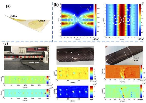 In view of the anisotropic characteristics of the electrical conductivity of CFRP, the research team established an anisotropic three-dimensional electromagnetic field calculation model to study the distribution of induced currents in the carbon fiber samples. The research team used a prototype probe built by themselves to carry out the inspection and imaging of cylindrical CFRP samples with artificial defects, curved surfaces with artificial cracks and curved samples with natural impact defects. The experimental results showed that the probe can effectively detect tiny defects on the curved CFRP structures. This means that the proposed probe can has broad application prospects.