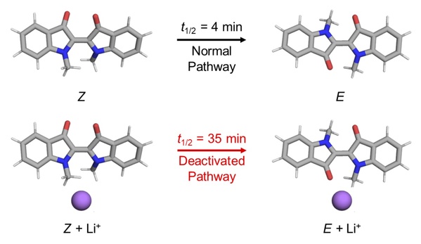 In Qiao Bo’s research, his master student Shen Zhennan found that the addition of metal salt (i.e. metal cations like Li+, Na+, etc.) into the solution of the indigo molecular photoswitch can slow down the rate at which the molecule in the Z state transitions back to the E state, reducing the thermal relaxation time of the indigo molecule from about 4 minutes to about half an hour (Figure 3). Shen Zhennan also found that by changing the concentration of added metal cations, the thermal relaxation time of the indigo photoswitch can be precisely adjusted within the above time interval.