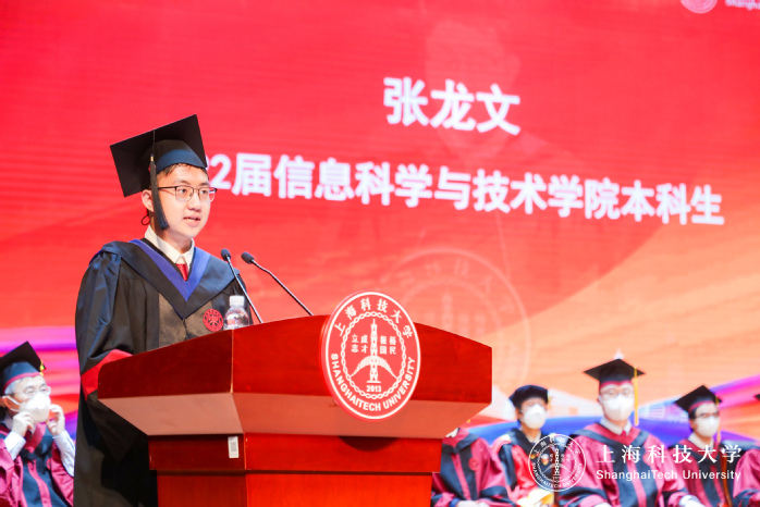 Following this, the representative of the graduating undergraduates, and winner of the President’s Award, Zhang Longwen from SIST delivered his graduation speech. He sincerely thanked the university for providing students with valuable opportunities and challenges, encouraging students to continuously break through, explore the unknown, innovate, start their own businesses, and not be afraid of the challenges of the unknown. My original plan was to go abroad for my master study, but the sudden pandemic that happened in March trapped me and changed the trajectory of my life. I finally chose to continue my master study at ShanghaiTech to meet the unexpected new challenges. Even though this was totally outside my expectations, I will continue to break through myself.