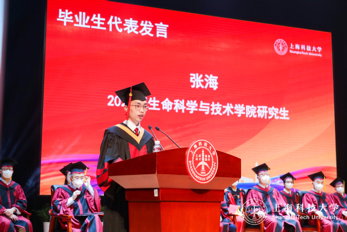 The representative of graduate students, and winner of the President's Award, SLST Zhang Hai shared his scientific research experience in his address. He spent 7 years researching more than 40,000 genetic loci in rice leading to the discovery of a locus with thermotolerance. With this discovery, the yield of rice under extreme high temperature could be increased by more than 2.5 times, having a high application value. He expressed his wish to ShanghaiTech students that in the future, they will continue to make breakthroughs and achievements with indomitable perseverance, courage and faith.