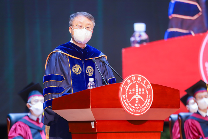 After the representatives gave their speeches, ShanghaiTech President Jiang Mianheng delivered his Commencement address on “younger generation’s virtues”, reflecting his expectation for graduates to be smart, innovative, altruistic and just. He said the Class of 2022 was very special in that they suffered the Covid-19 impacts twice, both in 2020 and 2022, as well as having witnessed ShanghaiTech being selected for development at the national level. The lockdown in mid-March was also an additional exam for this year’s grads, to test their virtues of responsibility, self-discipline and dedication. “Every word in the mission statement of ShanghaiTech is not just a word. ShanghaiTech is committed to provide three ‘classrooms’ for every student,” said Jiang Mianheng. “A campus classroom to provide knowledge and innovation. A social classroom to cultivate concerns for family and country. A spirit classroom to enhance and forge moral qualities.” He also encouraged the graduates to maintain infinite curiosity of mind, exploring the unknown, insisting on the truth, and being pioneers. “A qualified person should be strong in will, powerful to take up his duty, and honest in spirit. Be a qualified young generation with inner virtues first before you start to make greater achievements.”