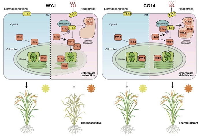 The TT3.1-TT3.2 genetic module discovered in this research is the first to link the high temperature response signal between the plasma membrane and chloroplast, revealing a completely new molecular mechanism of plants’ response to extreme heat stress. Under extreme high temperature (42 °C was set in the research), plasma membrane–localized E3 ligase TT3.1 translocates to the endosome, on which TT3.1 ubiquitinates chloroplast precursor protein TT3.2 for vacuolar degradation, implying that TT3.1 might serve as a potential thermoreceptor. Less accumulated, mature TT3.2 proteins in chloroplasts are essential for protecting thylakoids from heat stress. These findings not only reveal a TT3.1-TT3.2 genetic module at one locus that transduces heat signals from plasma membrane to chloroplasts but also provides the strategy for breeding highly thermotolerant crops.
