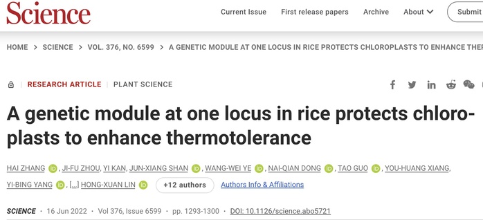 Recently, the research team led by ShanghaiTech Distinguished Adjunct Professor Lin Hongxuan, in collaboration with Professor Lin Youshun of Shanghai Jiao Tong University, identified a quantitative trait locus, Thermotolerance 3 (TT3), consisting of two genes, TT3.1 and TT3.2, that interact together to enhance rice thermotolerance. This research also elucidated a new regulation mechanism of rice thermotolerance. The whole research process took the team 7 years and if we take into account the additional time for preparation of the genetic materials, this research has lasted for nearly 10 years. The findings were published in Science on June 16.