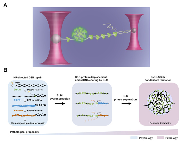 In this research, by using fluorescent optical tweezers, the researchers found that BLM under high concentration can compress newly-generated ssDNA and form co-condensates after double-stranded DNA (dsDNA) unwinding (Figure A). With the introduction of ATP, the capability of BLM to condense on ssDNA is potentiated, which further promotes the compression of ssDNA against a resistive force of up to 60 piconewtons. Moreover, the researchers provided direct evidence that BLM can compress ssDNA by first dismantling ssDNA-bound RPA or RAD51 proteins (Figure B).They further demonstrate that ssDNA co-phase separates with BLM and promotes the formation of dynamically arrested co-condensates of ssDNA and BLM with apparent decreasing reversibility.