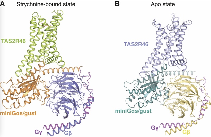 Overall structures of the strychnine-TAS2R46-miniGs/gust (A) and apo-TAS2R46-miniGs/gust (B) complexes.