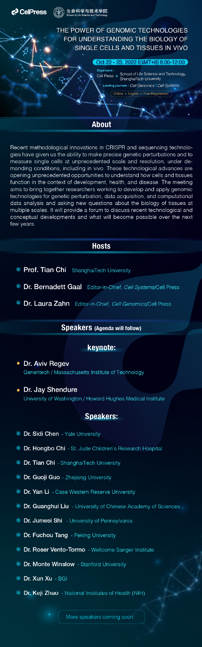 Please join us for the upcoming ShanghaiTech SLST-Cell Press Symposium (Free Registration). The meeting aims to bring together researchers working to develop and apply genomic technologies for genetic perturbation, data acquisition, and computational data analysis and asking new questions about the biology of tissues at multiple scales. It will provide a forum to discuss recent technological and conceptual developments and what will become possible over the next few years.