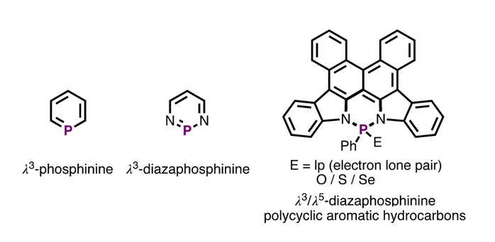 Azaphosphorus-heterocycles are the P-heterocycles where carbon (C) atom is replaced by nitrogen (N) atom. Due to the different electronic configurations between N atom and C atom, azaphosphorus-heterocycles exhibit distinct chemical structures and reactivities compared with their all-carbon-based counterparts. For example, diazaphosphinine (DP) (in the following figure) exhibits weaker aromatic character, larger dipole moment, and higher reactivity compared with phosphinine. Because of the limited synthetic pathway and/or high reactivity, there are few reports on synthesis, reactivity and theoretical studies of DP derivatives.