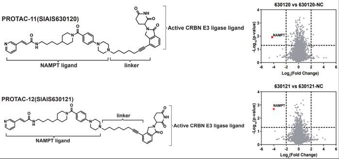 The researchers used a standard structure-activity relationship study for better design of NAMPT-targeting PROTAC compounds. A series of alkyl and PEG linkers with different lengths were incorporated to bridge the NAMPT inhibitor precursor FK866-A with the CRBN ligand. The team ended up with two highly effective PROTAC compounds, called 630120 and 630121. Both compounds exhibited minimal off-target side effects on other proteins as assessed by mass spectrometry.