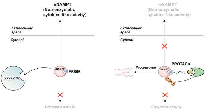 As an important small molecule metabolite, NAD+ is widely involved in a series of biochemical reactions in cell energy metabolism, such as glycolysis, oxidative phosphorylation, and fatty acid oxidation. Tumor cells proliferate faster and are prone to DNA damage, requiring more NAD+ consumption. NAMPT is a key rate-limiting enzyme for NAD+ synthesis. Aberrant overexpression of NAMPT has been reported in a variety of tumor cells and is a poor prognosis factor for patient survival. It plays an important role in tumor cell proliferation, acting concurrently as an NAD+ synthase and unexpectedly, an extracellular signaling molecule for several tumor-promoting pathways. While previous efforts to modulate NAMPT activity were limited to enzymatic inhibitors with low success in clinical studies, protein degradation offers the possibility to simultaneously disrupt NAMPT's enzyme activity and ligand capabilities.