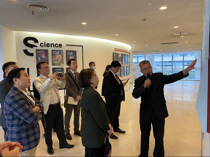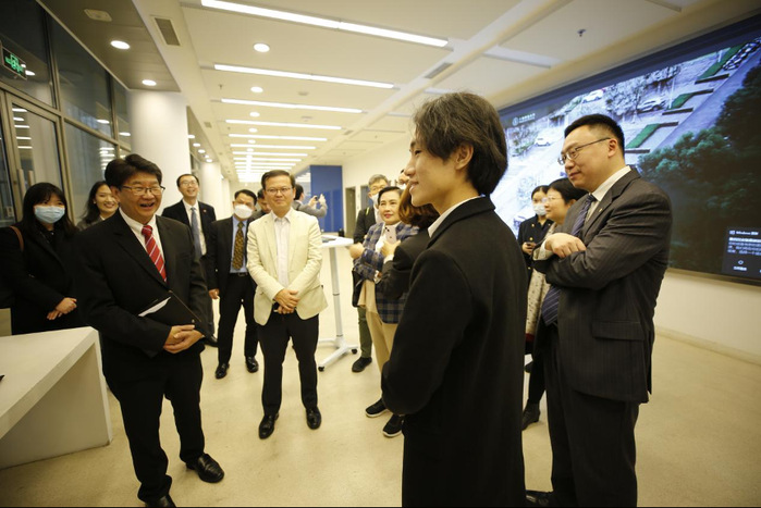 First, the delegation visited the Y Building where Prof. Yang Haitao, Executive Director of SIAIS and Prof. Zhong Guisheng, Assistant Director of iHuman Institute, introduced the history, outstanding faculty team and representative research achievements of the two institutes. The guests also learned about plans for the Center for Future Medicine, currently under construction, and were impressed by ShanghaiTech’s achievements in basic research and technology transfer. The delegation next visited the Multi-disciplinary Artificial Reality Studio (MARS) of SIST. They were amazed by the vivid visual demonstration and how artificial intelligence, computational imaging, and augmented reality technologies were integrated into practical applications.