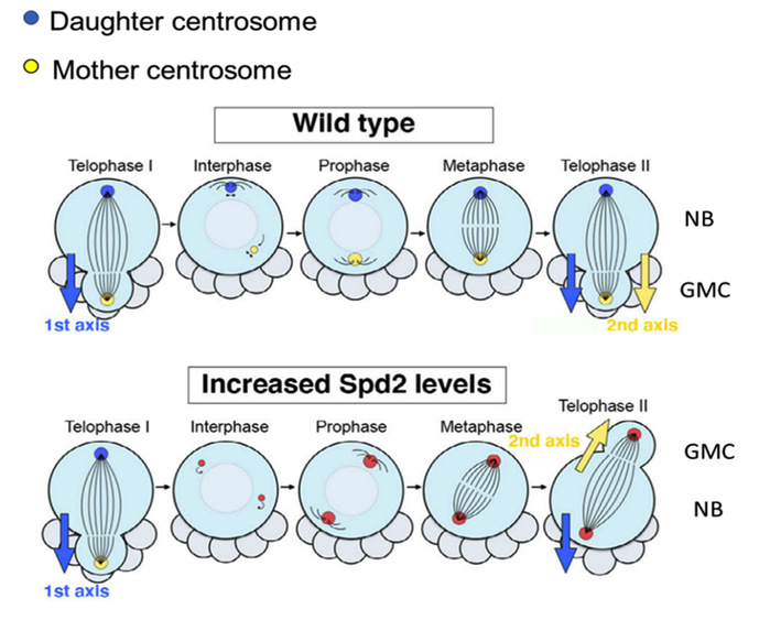 Inside the Drosophila neuroblasts (NB), two centrosomes show differential microtubule nucleation activity during interphase and this asymmetric activity of centrosomes is important for the division axis maintenance of the NB. Kimata’s research group identifies an evolutionally conserved centrosome component Spd2 (CEP192 in mammals) as a substrate of APC/C ubiquitin ligase—the cell cycle regulating enzyme. Through the live imaging of whole-mount Drosophila larval brains, the results showed that upon Spd2 stabilization or accumulation, both centrosomes lost microtubule nucleation capacity during interphase, and the apical centrosome became detached from the cortex to start wandering around the cytoplasm. In some of the larval brains with higher Spd2 levels, NBs showed significantly larger axis deviations. The daughter centrosomes, which were supposed to be inherited from neural stem cells, were mistakenly divided into a differentiating daughter cell.