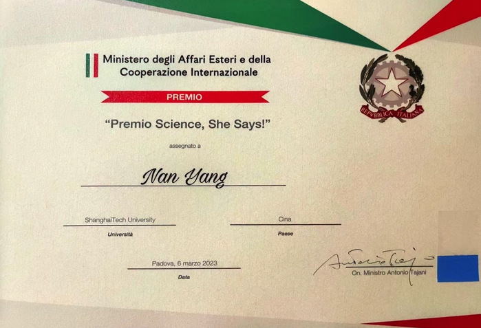 Yang Nan, Assistant Professor in SPST, was awarded the inaugural “Science, She Says!” Award by the Italian Ministry of Foreign Affairs and International Cooperation (MAECI). The Award is established to recognize outstanding junior female scientists, with no Italian descent, who has remarkable contributions to the advancement of bilateral cooperation in science and technology. Candidates from five regions across the world (Africa and the Middle East, Asia and the Pacific, Europe, Central and South America and the Caribbean, North America) are selected with one winner for each region, and Yang Nan won the Asia and the Pacific award.