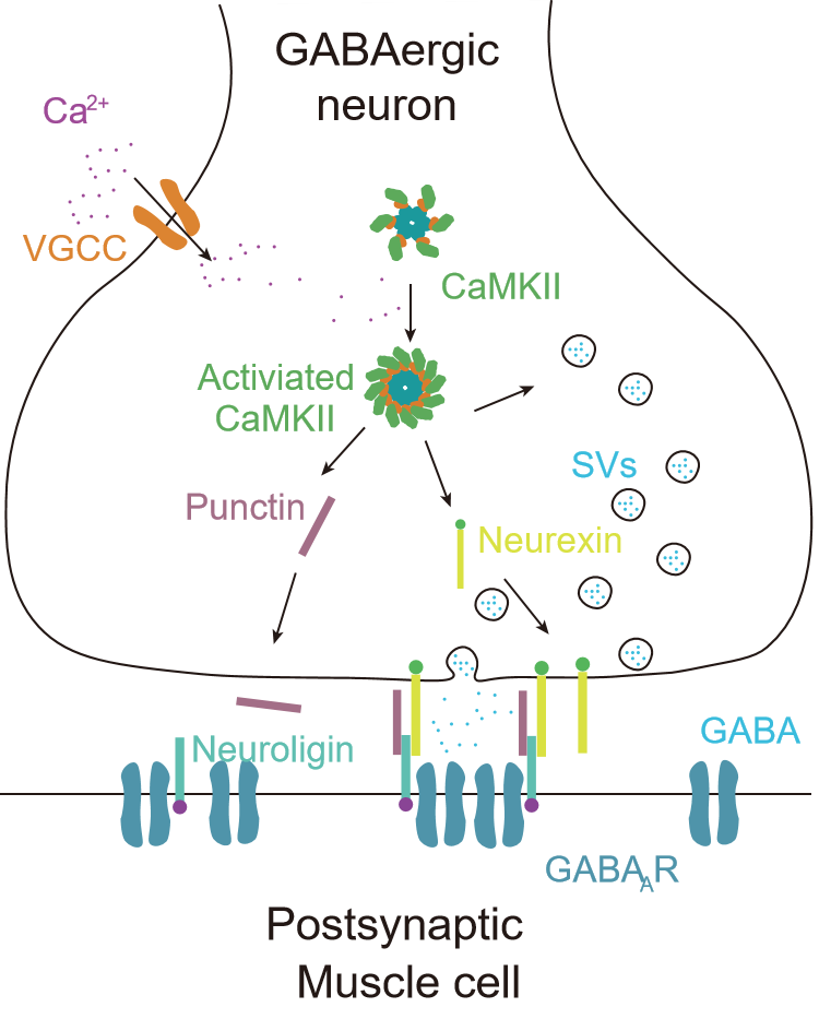 In this study, Tong’s group showed presynaptic CaMKII can trigger anterograde signal proteins Neurexin and Punctin to recruit GABAA receptors (GABAARs) and modulate inhibitory synaptic transmission at C. elegans neuromuscular junctions. They found that CaMKII promotes presynaptic Punctin secretion and Neurexin surface delivery in order to recruit postsynaptic Neuroligin to stabilize GABAARs. Furthermore, during the excitation of presynaptic neurons by optogenetics, CaMKII can sense the neural activity changes, thereby strengthening the anterograde signals and further boosting the recruitment of GABAARs. These results demonstrated that presynaptic CaMKII is involved in inhibitory synaptic plasticity. It is worth noting that the genes encoding this anterograde signaling pathway (CAMK2A, NRXN, NLGN, etc.) are linked with autism and other psychiatric diseases, and Tong’s study may provide new insights into the pathogenesis of these diseases.