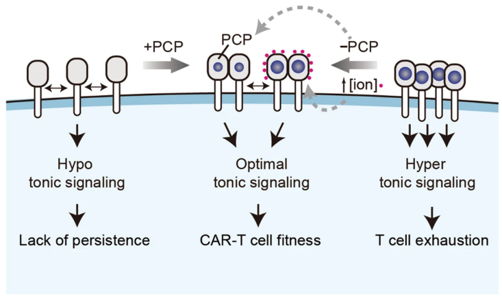 In this study, researchers revealed that electrostatic interactions mediated by positively charged patches (PCP) on the CAR surface drive tonic signaling (Figure 1). Most CAR-T cells targeting solid tumors tend to become exhausted due to the high tonic signaling intensity. However the tonic signaling of solid tumor CAR-T cells could be attenuated by increasing the ionic strength during the culture or shrinking the PCP. Conversely, some CAR-T cells targeting blood cancersmay have poor persistence due to insufficient tonic signal intensity, such as CD19 and CD22 CARs, while the tonic signal of such CAR-T cells can be enhanced by increasing the PCP to improve their in vivo persistence.