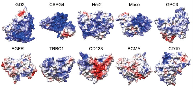 Figure 1. Surface charge distribution of CAR receptors (Electrostatics analysis of the ten CAR scFv constructions. Blue, positively charged surface; red, negatively charged surface).
