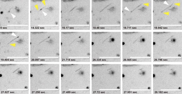 Movement pattern of tentacled particles. The white arrow points to the particle, and the yellow arrow points to the end of the tentacle.