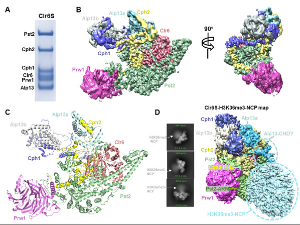The nucleosome is the fundamental unit of chromosomes in eukaryotes. The 147-base pair DNA wraps around the histone octamer, comprised of H2A, H2B, H3 and H4, forming the nucleosome particle. Previous studies demonstrated that histone tails are often subjected to post-translational modifications, including methylation, acetylation, ubiquitination, phosphorylation, and others. Most of these modifications are reversible. Taking the acetylation as an example, specific lysine residues of histone H3 and H4 are acetylated by the histone acetyltransferase (HAT) complexes, whereas the histone deacetylase (HDAC) complexes are responsible for removing these acetyl groups from histone tails. The acetylation level in eukaryotes is tightly controlled by HATs and HDACs. Abnormalities in acetylation lead to the occurrence of severe diseases and even cancers. Class I histone deacetylase enzymes, whose representatives are the Saccharomyces cerevisiae Rpd3S complex and its homolog Clr6S complex in Schizosaccharomyces pombe, utilize a zinc ion as its co-factor to catalyze the deacetylation. According to previous studies, Clr6S complex comprises six subunits, including Clr6, Pst2, Prw1, Alp13, Cph1, and Cph2, with a molecular weight of more than 400 kDa. Despite many years of study, high-resolution structural information on Rpd3S or Clr6S complex has not been reported.