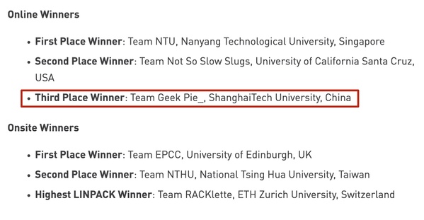 ISC High Performance 2023 (ISC 2023) is an international conference and exhibition for a global high-performance computing community of technology providers and users. The final results of the Student Cluster Competition of the ISC 2023 were recently announced in Hamburg, Germany, and the team GeekPie_ from ShanghaiTech University won third place in the online competition. The first and second place teams were from Nanyang Technological University and the University of California Santa Cruz.