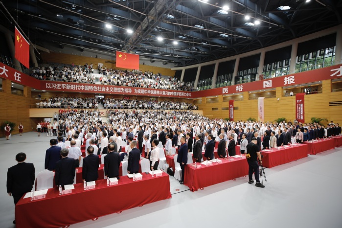 With the sound of the National Anthem, ShanghaiTech University opened the celebration of its 10th anniversary at the Athletic Center on the morning of September 28. Over 2,000 people attended the celebration on site, including officials of the state and Shanghai government, members of the University Governance Board, leaders of the Chinese Academy of Sciences (CAS), universities and institutes affiliated to CAS, universities from Shanghai and other provinces, students, faculty, staff, alumni, and media press.