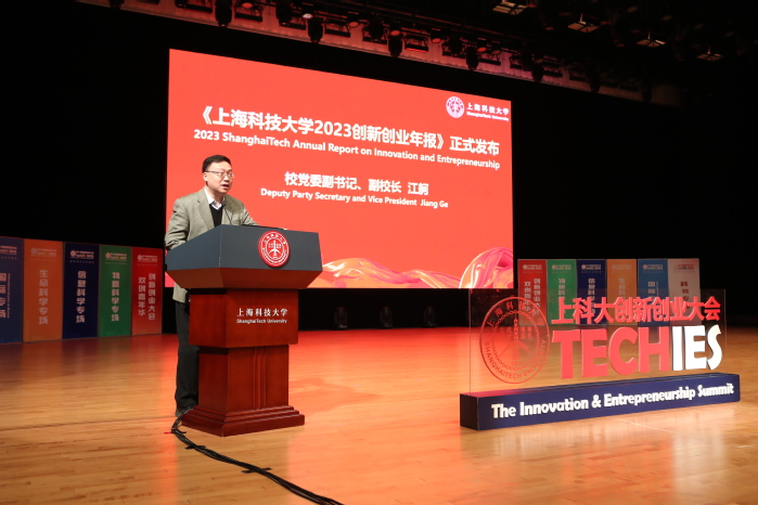 At the beginning of the event, Vice President Jiang Ge announced the release of the ShanghaiTech Annual Report on Innovation and Entrepreneurship 2023, which reviewed what ShanghaiTech has achieved in scientific innovation, research platforms, tech transfer, and science popularization in the past year. Jiang Ge said that, in 2023, the number of scientific research projects and the amount of funding had reached new highs, fruitful research results continued to grow, the building of large-scale scientific facilities progressed steadily, and the construction of Shanghai Clinical Research and Trial Center was at an advanced stage. Additionally, the patent operation of ShanghaiTech has won seven awards in the industry, the number of patent licensing contracts has been at the forefront of Chinese universities for four consecutive years, and the transfer projects have also reached several landmark milestones.