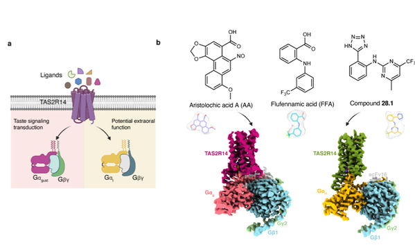 The study focuses on TAS2R14, a bitter taste receptor known for its role in discerning bitter flavors and its widespread expression in various tissues beyond the tongue. Using cutting-edge cryo-electron microscopy (cryo-EM) techniques, the researchers captured detailed structures of TAS2R14 bound to three potent agonists: aristolochic acid (AA), flufenamic acid (FFA), and compound 28.1 (Figure 1).