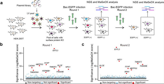 In this study, the researchers employed a cell surface protein-focused CRISPR/sgRNA library (SfCRISPR) they designed and constructed to conduct a forward genetic screen on a recombinant baculovirus carrying EGFP transgene (Bac-EGFP). After two rounds of negative selection, they identified several candidate host dependency factors for baculovirus transduction in human cells, including EXTL3 and NPC1. Further investigation revealed that EXTL3 influences baculovirus attachment and entry by participating in heparan sulfate biosynthesis, while NPC1 facilitates baculovirus transduction by mediating membrane fusion and endosomal escape. Notably, disruption of Npc1 gene significantly reduced baculovirus transduction in mouse liver.