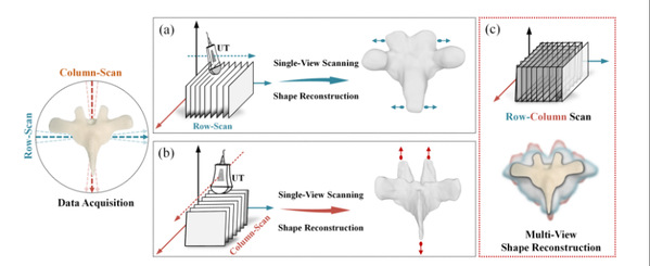 Two typical single-view scanning and reconstruction methods, and the multi-view scanning and reconstruction proposed in this study.