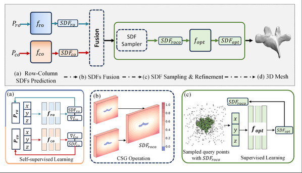This study proposes a Row-Column scanned Neural Signed Distance Field (SDF), developing the first framework capable of accurately reconstructing three-dimensional anatomical structures from multi-view ultrasound scans. The framework uses four key technical steps to iteratively optimize the target structure from coarse to fine. This design overcomes the limitations of traditional pixel/voxel-level algorithms by enabling multi-view reconstruction to be directly edited and processed at the three-dimensional shape level.