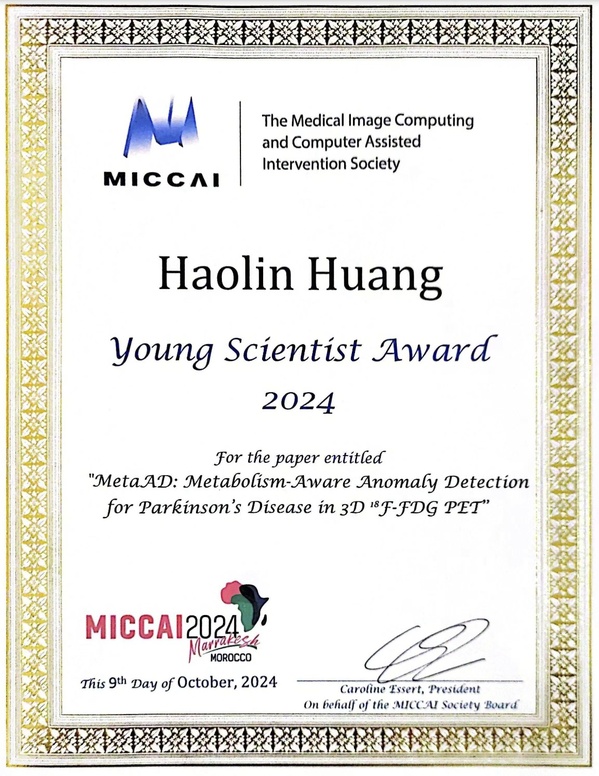 The “Young Scientist Award 2024” was awarded for the paper entitled “MetaAD: Metabolism-Aware Anomaly Detection for Parkinson’s Disease in 3D 18F-FDG PET.”