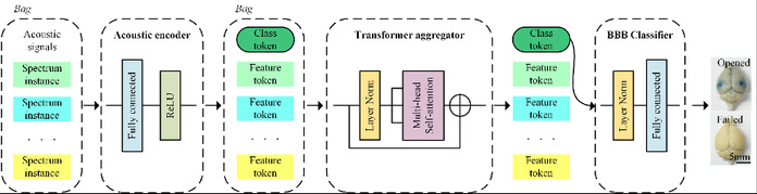 To address this challenge, Prof. Cheng’s group proposed a deep learning model called Simple Transformer-based model for BBB Opening Prediction (SimTBOP) (Figure 2). This innovative method integrates acoustic feedback signals during the FUS-mediated BBB opening and utilizes multiple instance learning (MIL) to enable rapid and accurate assessment of BBB opening outcomes, achieving accuracy rates of up to 96.7%.