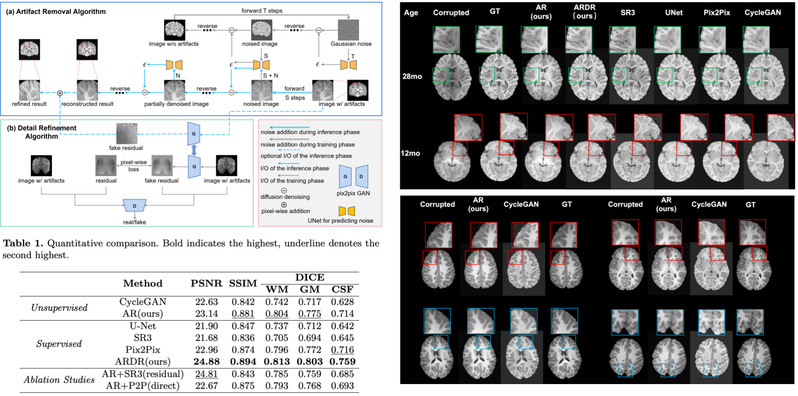 In this study, Deng Haowen and Zhu Zihao, master’s students in Associate Professor Zhang Han’s research group, proposed an unconditional diffusion-based algorithm for removing head motion artifacts in MRI scans of children aged from 0 to 6 years. The framework only uses artifact-free data for training and inference, overcoming the reliance on paired datasets required by traditional artifact removal algorithms.