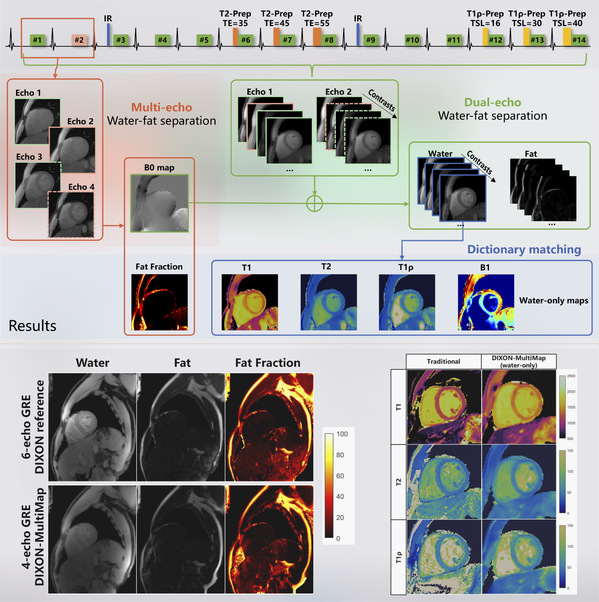 PhD student Lü Zhenfeng in Assistant Professor Qi Haikun’s research group developed a new MRI technique called “Dixon-MultiMap,” which enables the simultaneous and precise quantification of cardiac fat fraction and T1/T2/T1ρ parameters. This technique integrates hybrid multi-echo Dixon readouts with a multi-parameter quantitative framework, using four-echo data to obtain high-precision B0 field and fat fraction maps while improving the accuracy of water-fat separation in dual-echo multi-contrast images. The water-phase multi-contrast images are then matched with a dictionary to achieve B1+-corrected multi-parameter quantification. This technique provides an efficient and integrated solution for the non-invasive assessment of fat-infiltrative myocardial diseases.