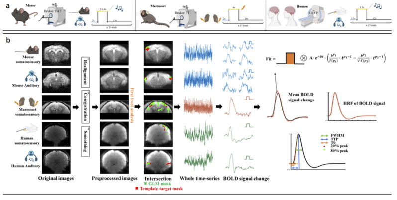 In this study, master’s student Chen Qian in Assistant Professor Ma Zhiwei’s research group systematically compared the spatiotemporal characteristics of hemodynamic response functions in mice, marmosets, and humans in the awake state. This research provides key parameters for the translational application of neuroimaging animal models.