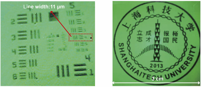 Figure 2: Resolution test image of the infrared upconversion detector (left) and infrared visualization of the ShanghaiTech University emblem using the upconversion detector (right).