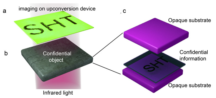 The device’s high resolution and large working area make it suitable for direct visualization imaging. The team successfully demonstrated high-definition infrared imaging of the ShanghaiTech University emblem (Figure 2). Furthermore, the device can image confidential information concealed between two opaque substrates (Figure 3), clearly revealing hidden “SHT” text through the upconversion detector.