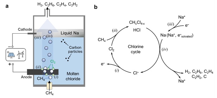 The researchers integrated electrochemical and thermochemical processes by leveraging the well-established molten salt electrolysis technology from the metallurgical industry. In this process, chloride ions are oxidized at the anode into chlorine gas, while sodium ions are reduced to metallic sodium at the cathode. A small amount of sodium dissolves in the molten electrolyte, producing solvated electrons. When methane is introduced into the molten electrolyzer, it reacts rapidly with chlorine at the anode, forming chlorinated hydrocarbons and hydrogen chloride. As the gases rise, these intermediates react with metallic sodium or solvated electrons at the cathode, yielding hydrogen, ethylene, and carbon materials. The chlorine ions are then recycled back into the molten electrolyte, forming a closed-loop system.