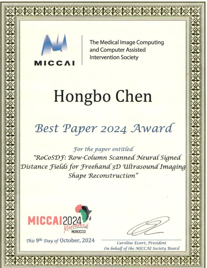 Building on clinical feedback, I worked with my team to propose novel distance function fields to enhance the precision of multi-view 3D ultrasound imaging. This innovation enables surgeons to locate targets faster and more accurately, reducing radiation exposure for both doctors and patients. The work was accepted by MICCAI 2024, where I delivered an oral presentation and received the conference’s sole Best Paper Award. Reflecting on these achievements, I deeply appreciate the systematic research training I experienced at ShanghaiTech, which deepened my expertise, sharpened my research skills, and fostered comprehensive growth. Through rigorous coursework, seminars, and mentorship, I built a robust knowledge foundation and a disciplined research mindset, laying a solid groundwork for my academic journey.