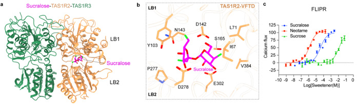 To validate these findings, the team developed a sensitive pharmacological assay at the cellular level (Figure 3c), enabling robust detection of weakly active natural sweeteners. Using this assay, they confirmed the functional importance of residues involved in sucralose binding and further explored the binding modes of sucrose and neotame via molecular docking and functional studies. Despite sharing the same binding pocket within TAS1R2, each sweetener interacts differently with the receptor, revealing distinct molecular mechanisms that explain variations in perceived sweetness.