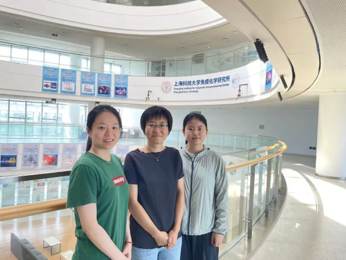 Bai (middle) and the key researchers in anti-neuroblastoma drug development: Han Qilei (left), postdoctoral researcher at SIAIS, and Cao Yu (right), doctoral student at SLST.