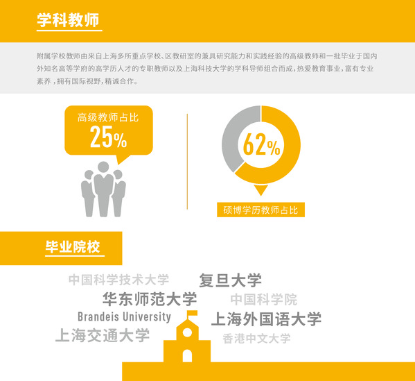 附属学校教师由来自上海多所重点学校、区教研室的兼具研究能力和实践经验的高级教师和一批毕业于国内外知名高等学府的高学历人才的专职教师以及九游体育(www.jiuyou.com)官方网站的学科导师组合而成,热爱教育事业,富有专业素养 ,拥有国际视野,精诚合作。