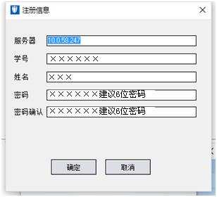 C、输入服务器:10.11.88.6、学号(或工号)、姓名、密码信息,点击【确定】完成注册操作。