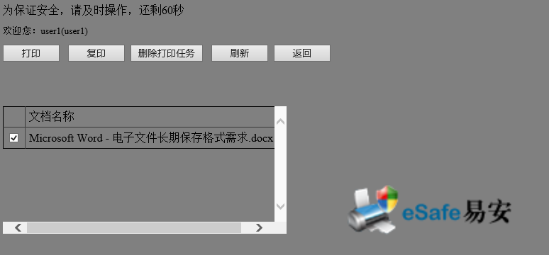 A、打开需要打印的文档,点击【打印】,选择【eSafePrinter】,如下图所示: